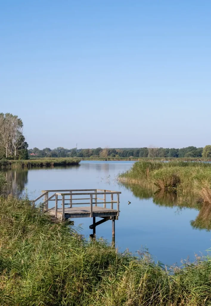 Das Foto zeigt eine der Aussichtsplattformen am Achterwasser, ein Paradies für die Natur und all seine Bewohner.